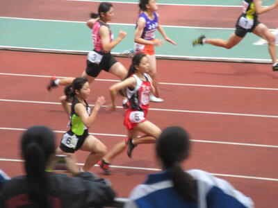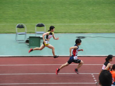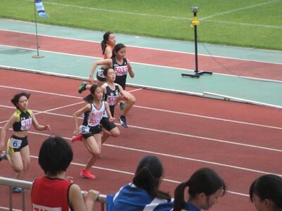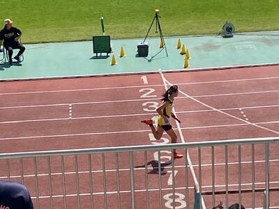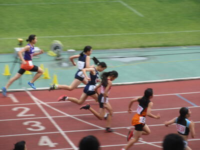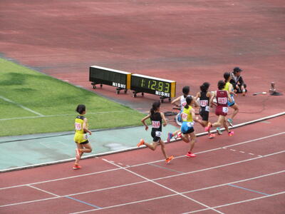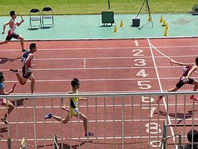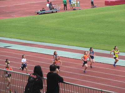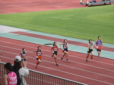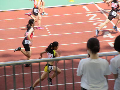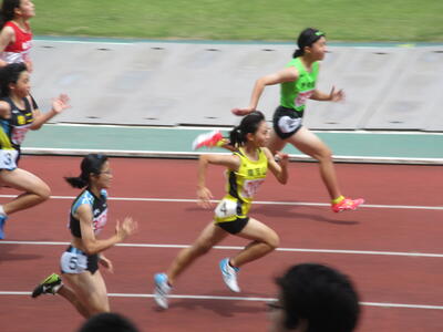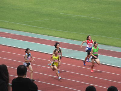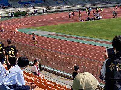 ホームストレートは5m以上もの向かい風に見舞われる中、本校陸上競技部(黄色のユニフォーム、黒の肩ライン)は数多くの競技に出場。自己記録の更新を目指し、全力で各種競技に取り組んでいました。