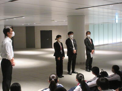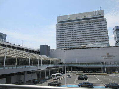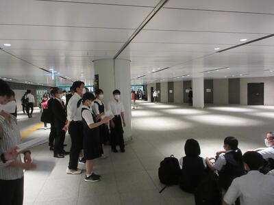広島駅に到着した3年生。歩きながらバスの乗車隊形に並び替えます。改札を出ると左手に大きなホテル、本日宿泊する「ホテルグランヴィア広島」が見えました。