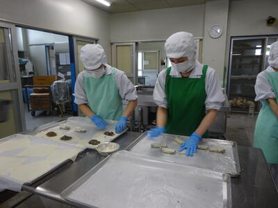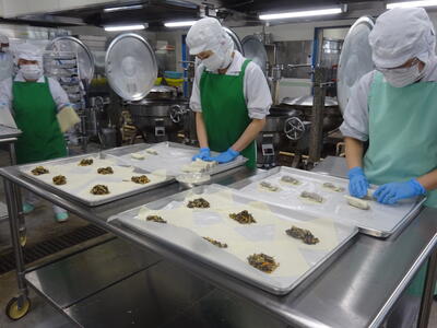 特にトーストは、子ども達のために調理員さんが黒ごまきな粉を一枚一枚、手作業で丁寧に塗ってくださった後、パンが硬くならないよう蒸気を入れながらオーブンで220℃、10分焼き上げたもの。1回で焼けるのは105枚であるため、東部中の分と合わせ、2台のオーブンがフル稼働で仕上げたそうです。黒ごまときな粉の香ばしい味わいがパンとマッチして抜群のおいしさです!