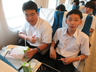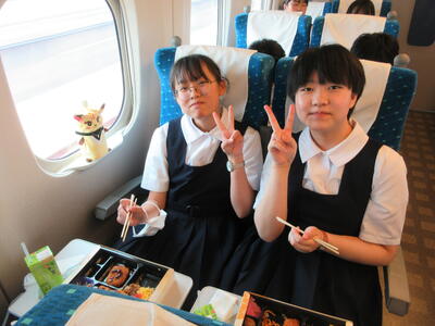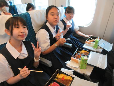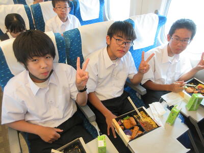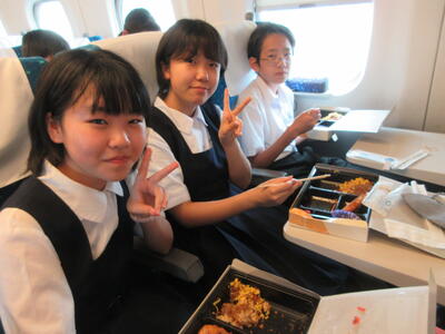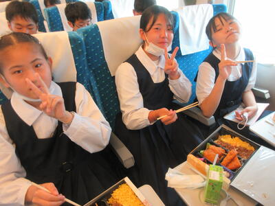 1日目の昼食は新幹線内です。おやつを食べたとは言え、朝が早かったせいもあり、お腹はペコペコ。豪華なお弁当を前に子ども達も笑顔があふれます。