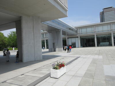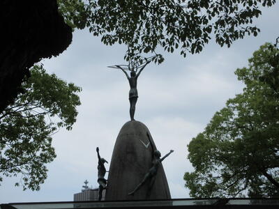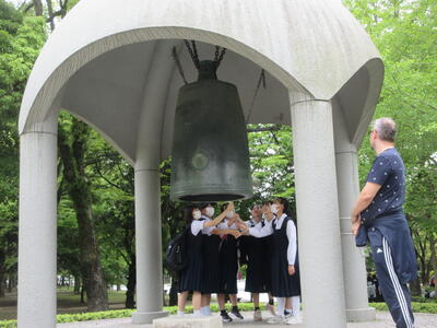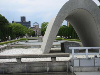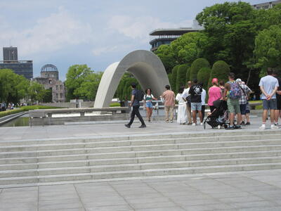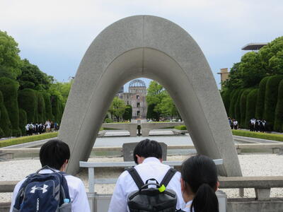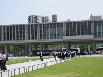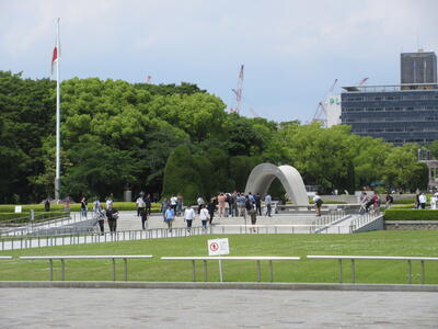 平和記念公園内にある平和のモニュメント。建築家の丹下健三氏の制作によるものとのことですが、一昨日はG7の首脳が、昨日は岸田首相とゼレンスキー大統領が歩き、祈りを捧げた石畳の上を南流中生が歩いています。