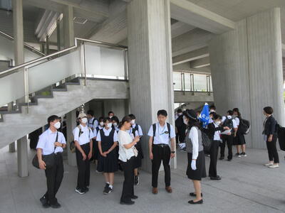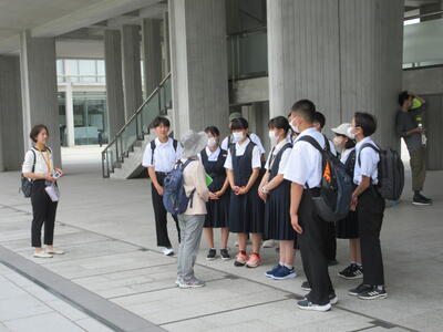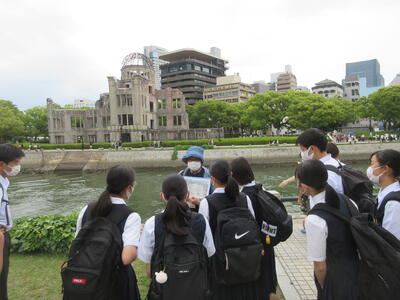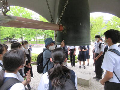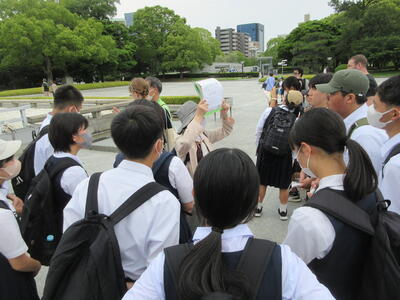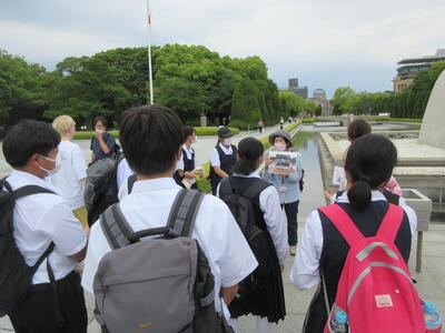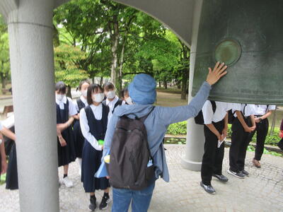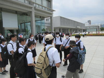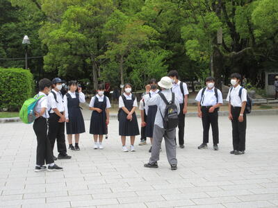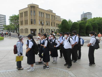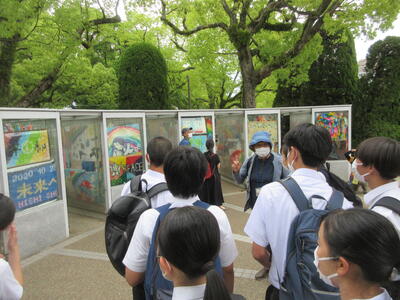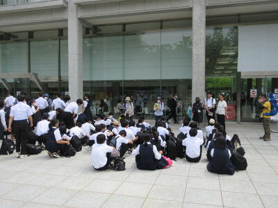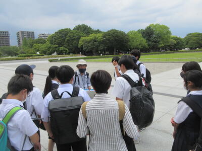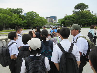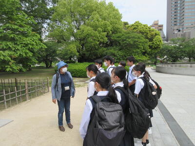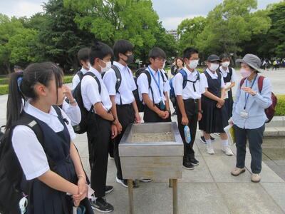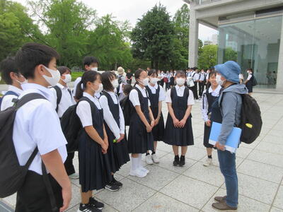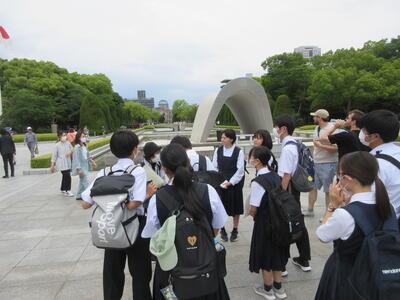 平和記念公園に到着した3年生。昨日までG7広島サミットが行われ、バイデン大統領やゼレンスキー大統領など、各国首脳が訪れた地に、南流山中の3年生が足を踏み入れます。昨日までは立ち入り禁止であった公園敷地内も、今日から一般に開放。