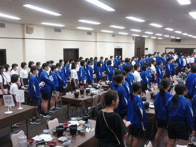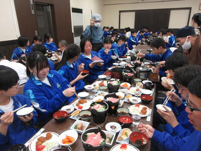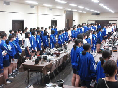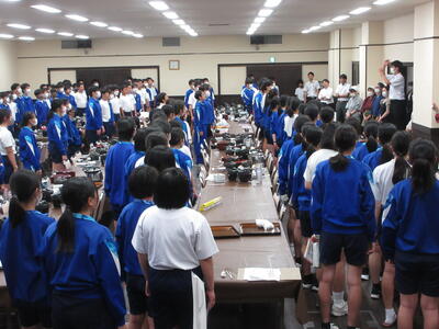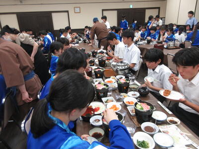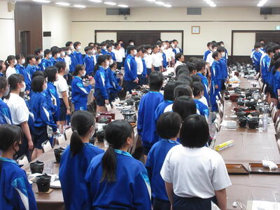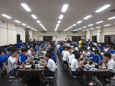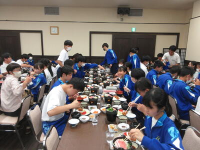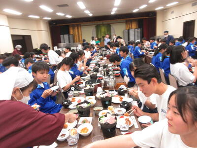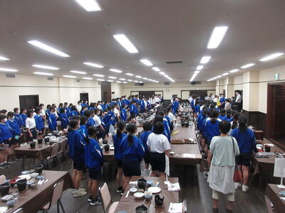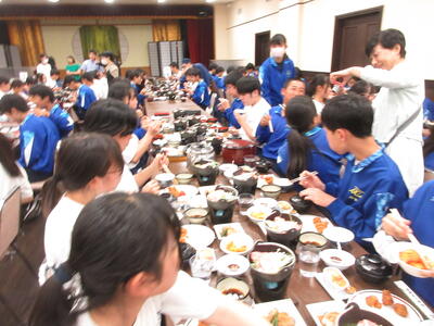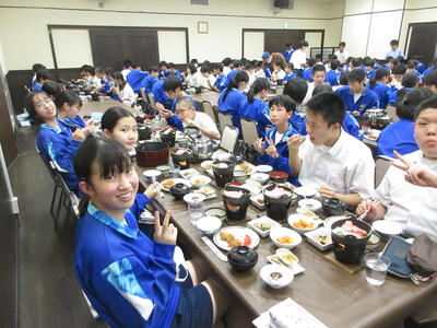 2日目の夕食は、豚しゃぶ、鶏唐揚げ、サラダ、豚角煮、ラザニアグラタン、海老チリ、白ご飯、すまし汁、チョコレートケーキ。宿の方からのお話の後、学年全員で声をそろえて「いただきます!」の挨拶を行い、勢いよく食べ始めました。