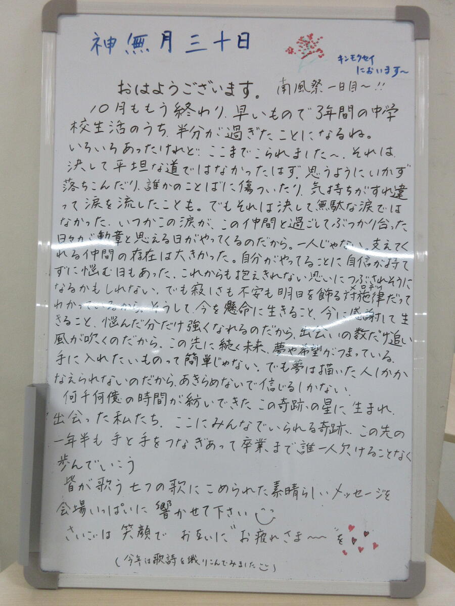 2年生合唱の部をご紹介する前に、今日のC棟2階のホワイトボード。