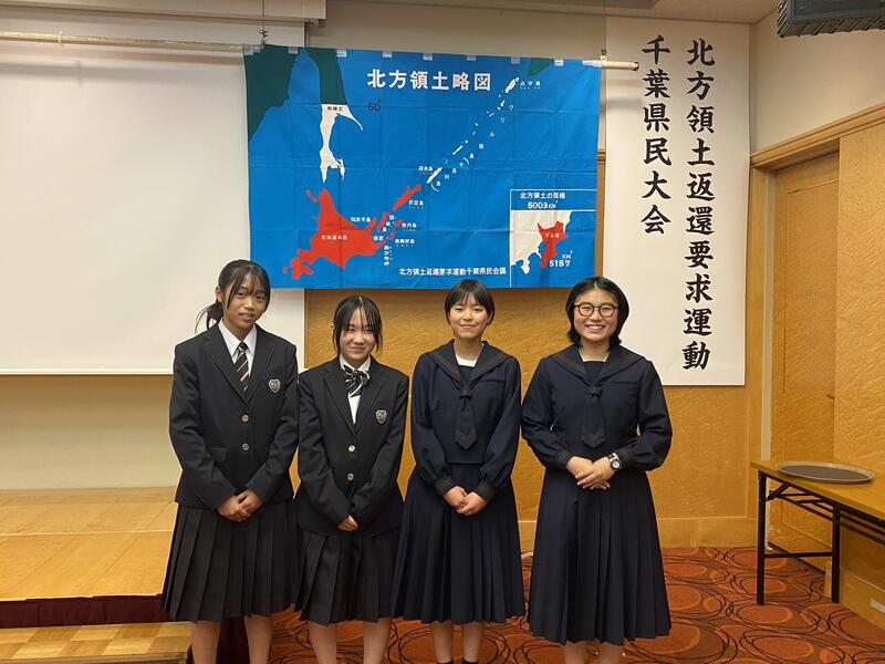 本校からは、夏休み中の8月25日から27日に「北方領土返還要求運動 千葉県民会議 青少年等現地視察事業」で、東葛飾地区70以上の中学校を代表して北方領土隣接地域を訪れたメンバーが再び集結。メンバーを代表して生徒会長も務めた伊藤帆七海さん(3年)が登壇しました。伊藤さんは現地で実際に見聞きしたことや、そこから感じた北方領土問題について、何とかして広めていきたいという思いを、当事者の方々の思いに寄り添いながら、丁寧に発表しました。