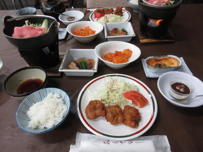 一覧へ 1. ☆5月23日(火)修学旅行2日目ニュース5 投稿日時: 2023/05/24 サイト管理者 2日目の夕食は、豚しゃぶ、鶏唐揚げ、サラダ、豚角煮、ラザニアグラタン、海老チリ、白ご飯、すまし汁、チョコレートケーキ。宿の方からのお話の後、学年全員で声をそろえて「いただきます!」の挨拶を行い、勢いよく食べ始めました。 京都ならではのお昼しっかりを食べてきたとは言え、半日歩き続けた子ども達はお腹もペコペコ。夕食メニューを次々に平らげていきます。3年生のみんな、しっかり食べて明日への英気を養ってくれよ!!