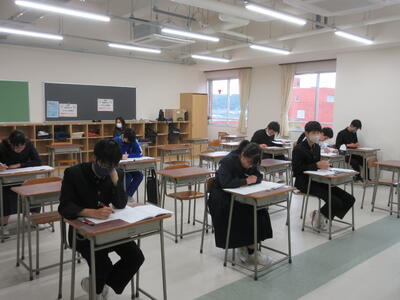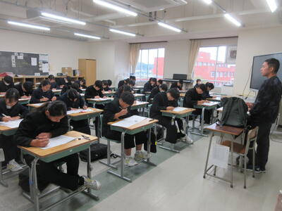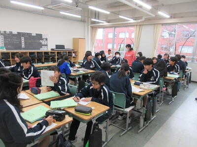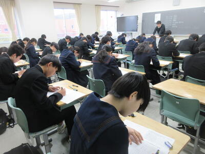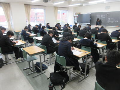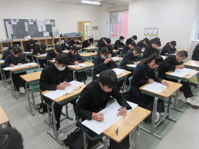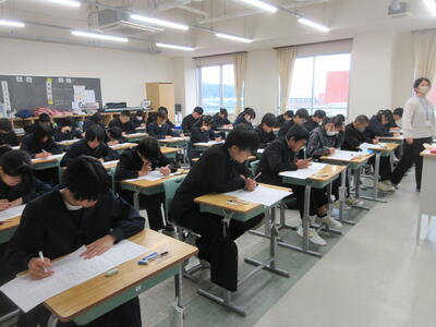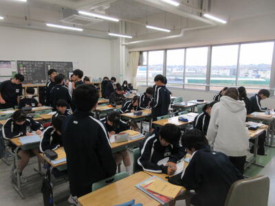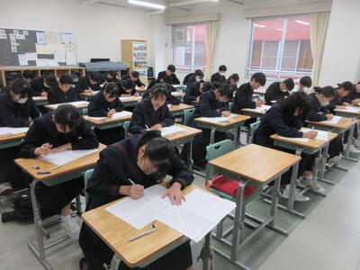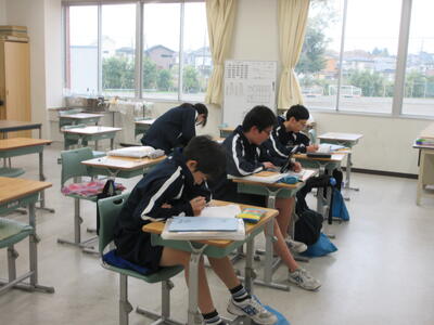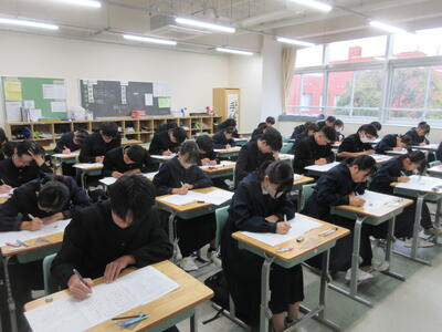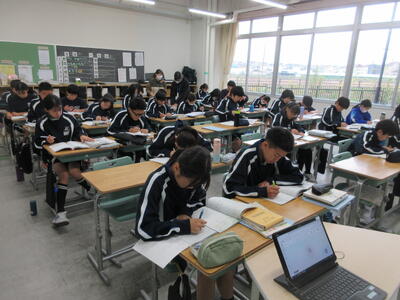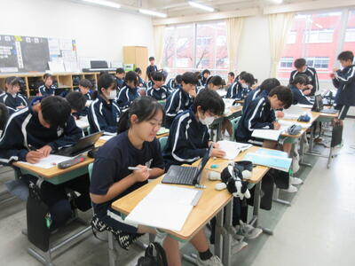 ▼3年生にとって進路決定の上でも重要な意味を持つ「後期中間試験」が、今日から2日間の日程で始まりました。 1校時は英語。リスニングテストの後、筆記試験に集中して取り組む子ども達です。3年生のみんな、頑張れ!!!!