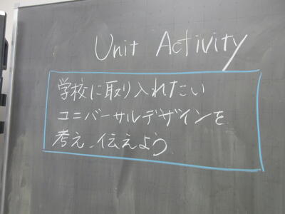 ▼英語の授業では「学校に取り入れたいユニバーサルデザインを考え、伝えよう」のテーマでグループごとに英語で表現していきます。
