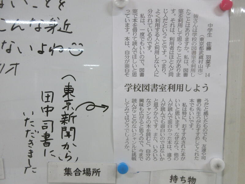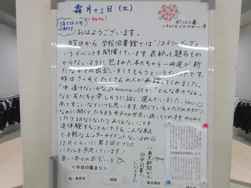 ▼C棟2階のホワイトボード。河崎先生が本校図書館の魅力を伝えてくれています。南流中には、利用しないのがもったいないほど「最高の図書館」(→詳細はこちら)があります。テストが終わり、一段落ついてからでも良いので、是非とも立ち寄って本の世界に浸ってみてはどうでしょうか。