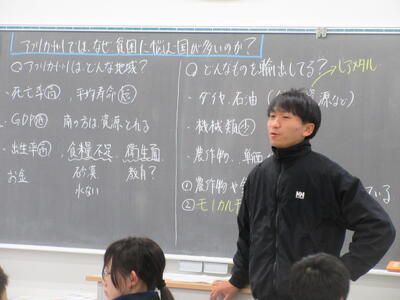 ▼1年生の授業の様子。社会科では「アフリカ州ではなぜ貧困に悩む国が多いのか?」をテーマに、両部先生が子ども達に熱く問いかけ、語りかけています。