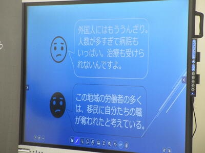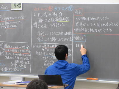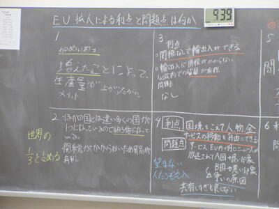 ▼社会科の授業。「EU拡大による利点と問題点は何か」。グループごとの話し合いの結果が黒板にびっしりと書かれています。様々な資料をもとに深く学んでいることがよくわかります。