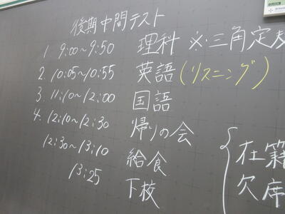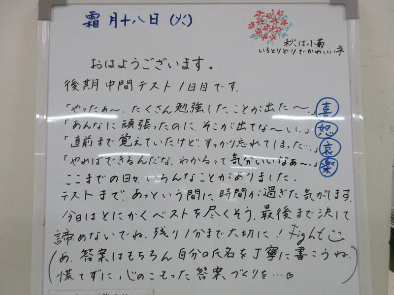 ▼C棟2階のホワイトボード。河崎先生から子ども達へ、テストを迎えるにあたっての思いが書かれていました。「心のこもった答案づくり」の言葉。そういえば、このホワイトボードに書かれている先生達の文字はいつも丁寧。子ども達への温かい思いが込められているからですね。