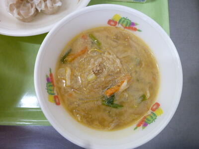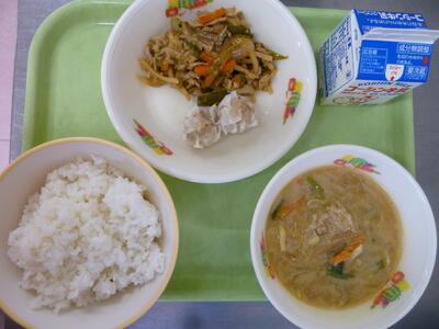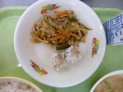 今日の給食は【ごはん、焼売、チンジャオロースー、豆乳坦々春雨スープ、牛乳】です。
