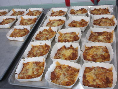 特にポテトのミートソースグラタンは、玉ねぎ150個、じゃがいも360個を炒め、味付けした後、生徒一人一人の器に丁寧に盛り付け、オーブンで焼くという手の込みよう。