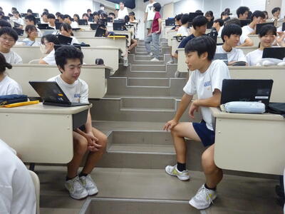 今日の特別授業は、「プレゼン授業・上級編」と題して行われました!生徒一人ひとりが夏休み中に準備してきたプレゼンを仲間と発表し合い、それを踏まえて蝦先生、三浦先生がさらなるブラッシュアップのために、実践的なアドバイスをしてくださいまいた!