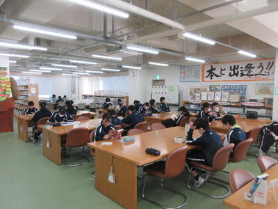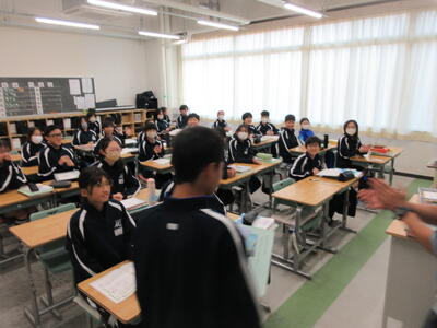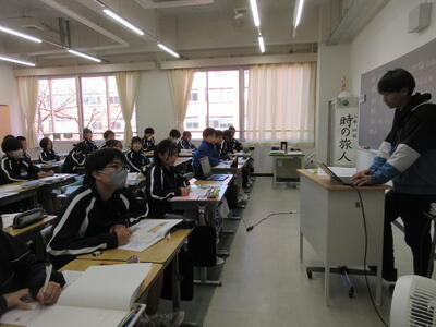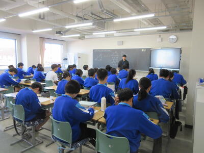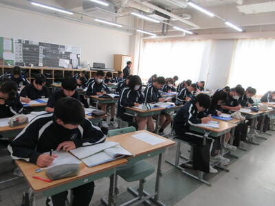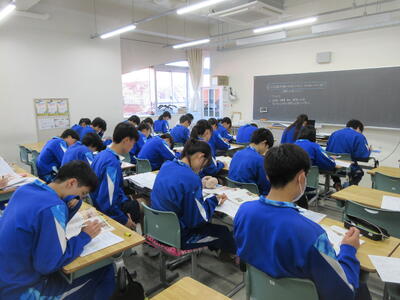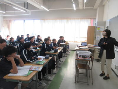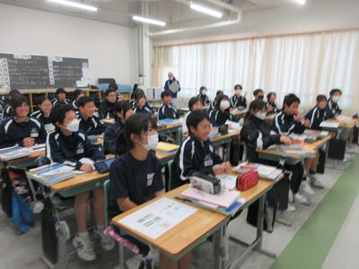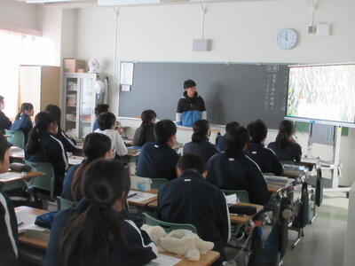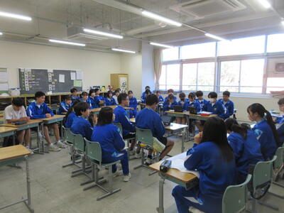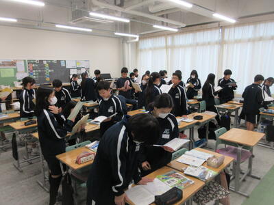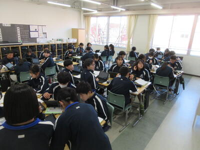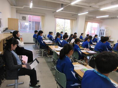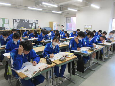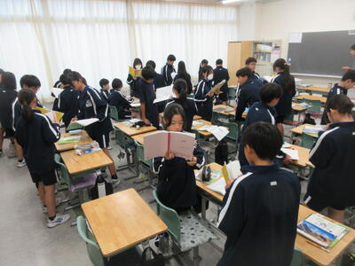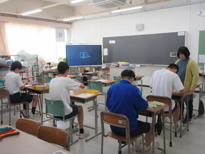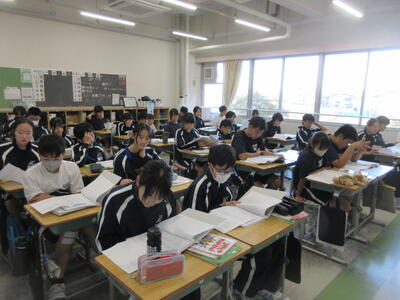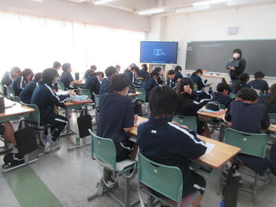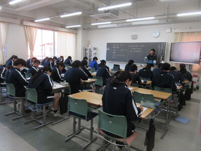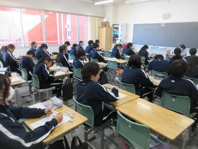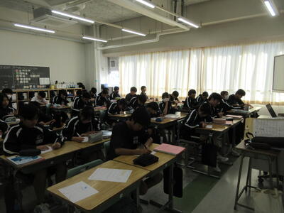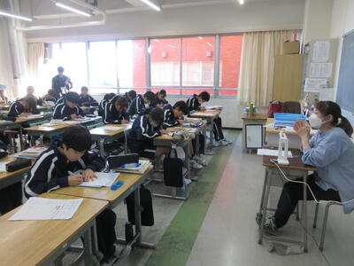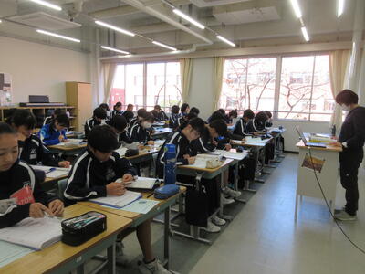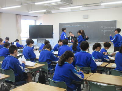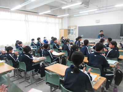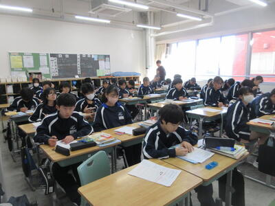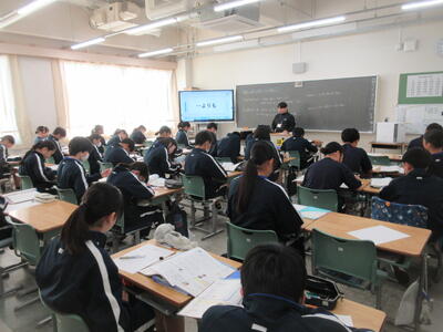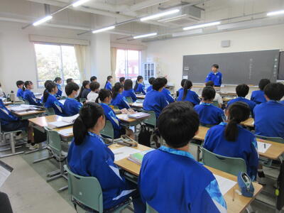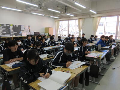 ▼1年生の授業の様子。中学校生活もこれで8ヶ月が終わり、だんだんと先輩らしく感じられる、落ち着いた授業の様子。