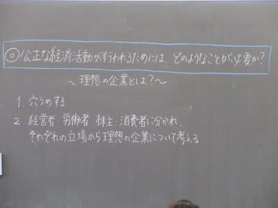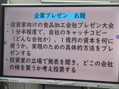 ▼社会科公民の授業。「公正な経済活動が行われるためには、どのようなことが必要か?」をテーマに、「企業プレゼン」の準備が行われています。
