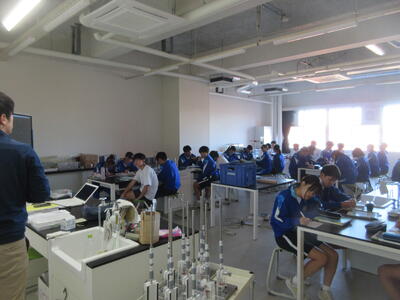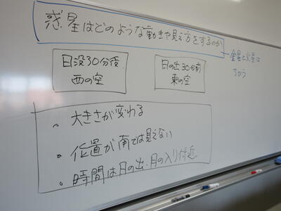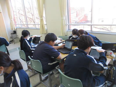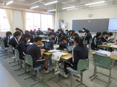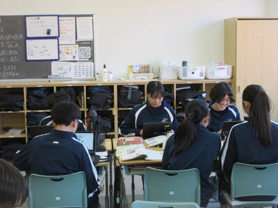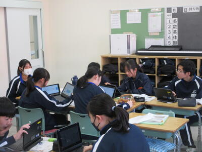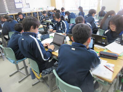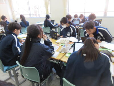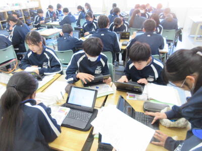▼2年生理科の授業。こちらもグループごとに天気について調べ、発表する準備を行っています。