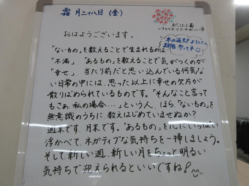 ▼C棟2階のホワイトボード。学年主任の渡邉久子先生から子ども達への11月最後のメッセージが書かれていました。「にじいろ」の歌詞「なくしたものを数えて 瞳閉ざすよりも あるものを数えた方が瞳輝きだす」を思い出します。自分の周りにあるたくさんの当たり前の幸せ。みなさんはいくつ数えられますか?