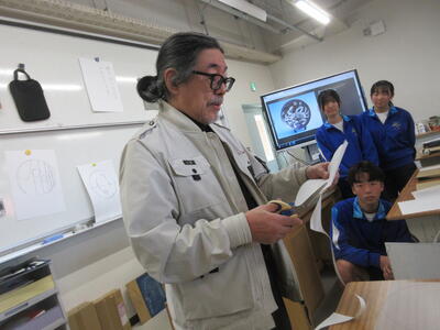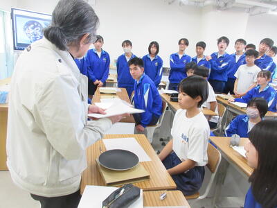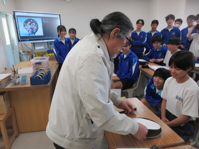 ▼第1美術室では、3年生の美術の授業。卒業に向けて絵皿作りが始まります。石原先生による実演入りでの指導は説得力抜群です。
