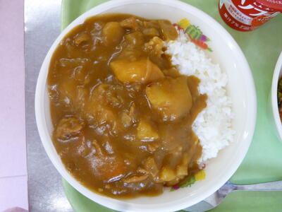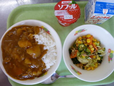 今日の給食は【ポークカレーライス、ツナサラダ、いちごヨーグルト、牛乳】です。