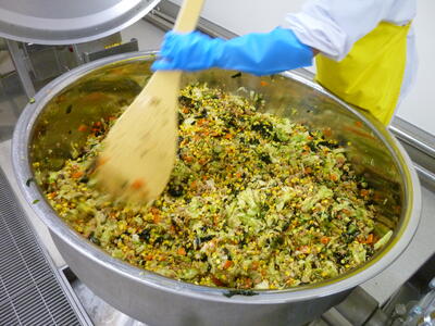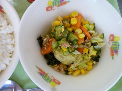 今日のサラダには、キャベツなどの野菜の他、海藻類、ツナを取り入れました。海藻類には、食物繊維が豊富に含まれています。食物繊維には2種類あり、水に溶けやすい「水溶性食物繊維」と水に溶けにくい「不溶性食物繊維」があります。このうち、海藻類には「水溶性食物繊維」が多く含まれています。水溶性食物繊維は、おなかの中の環境を整え、便秘を予防する、糖質の消化と吸収を穏やかにして、血糖値の急上昇を抑える、そして体内の余分なコレステロールに吸着して血液中のコレステロールを下げる、などの働きがあります