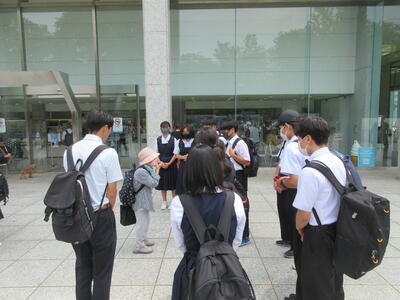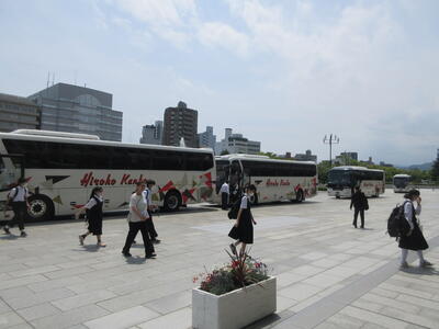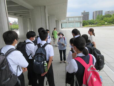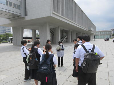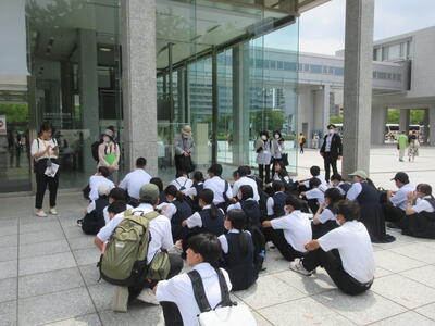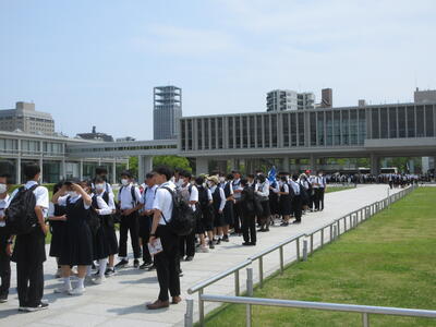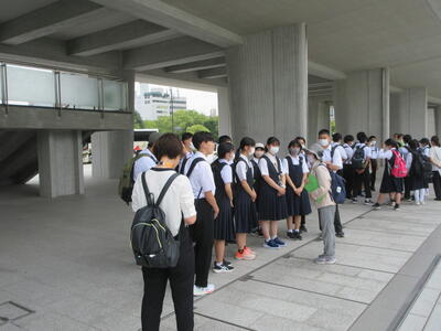 平和記念公園に到着した3年生。昨日までG7広島サミットが行われ、バイデン大統領やゼレンスキー大統領など、各国首脳が訪れた地に、南流山中の3年生が足を踏み入れます。昨日までは立ち入り禁止であった公園敷地内も、今日から一般に開放。