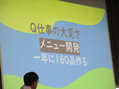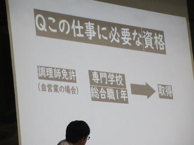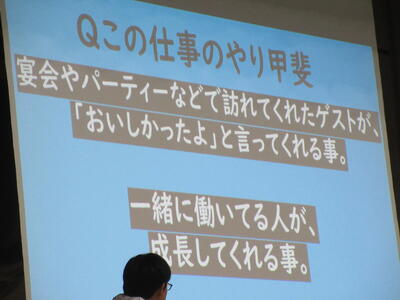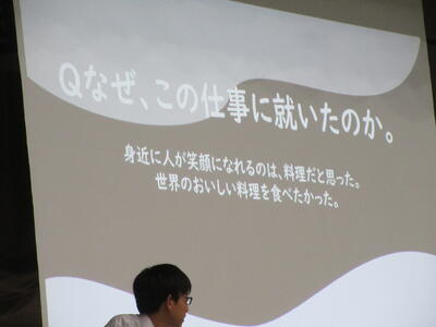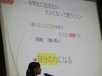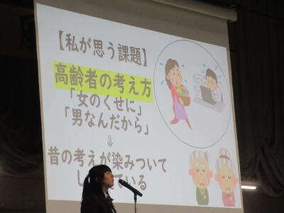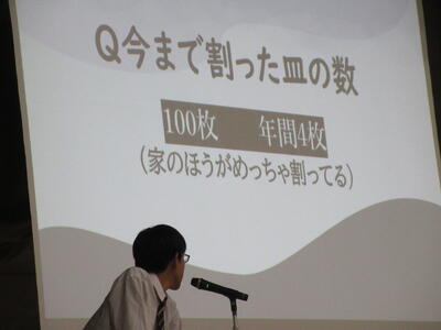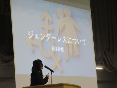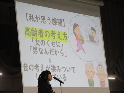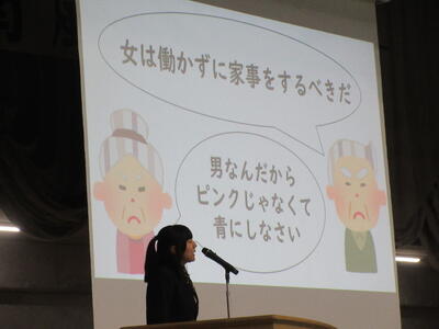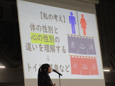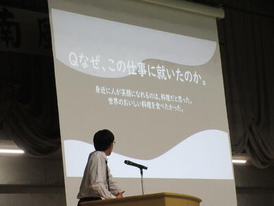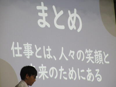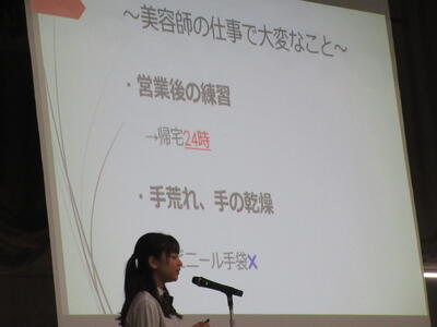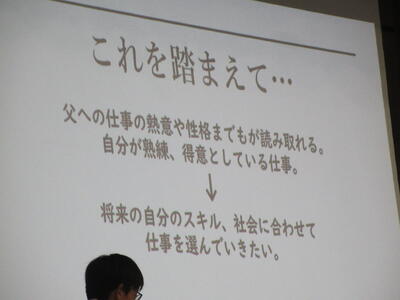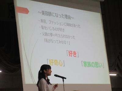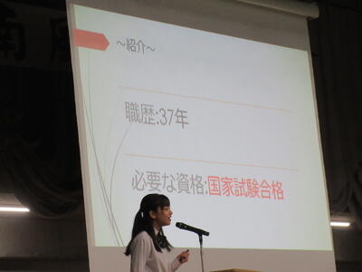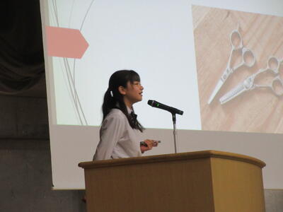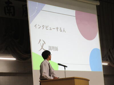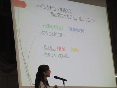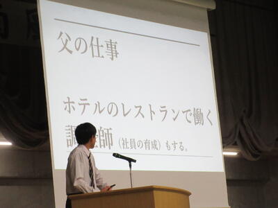 ▼プレゼンコンクール代表者の発表。初めは「働く人へのインタビュー」をテーマに1年生が登壇しました。
