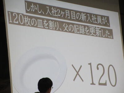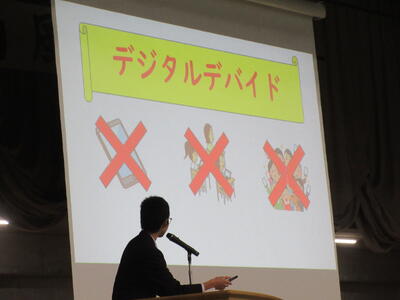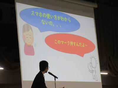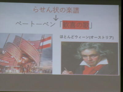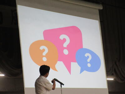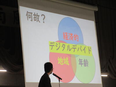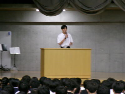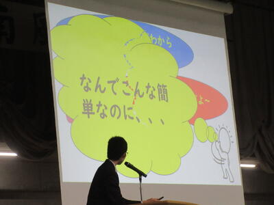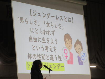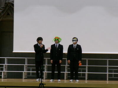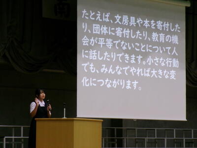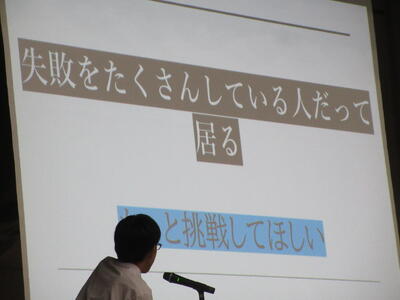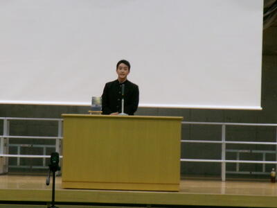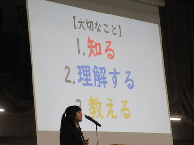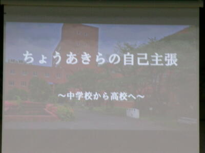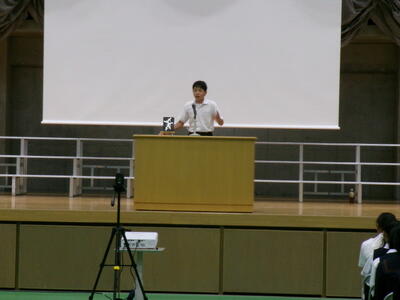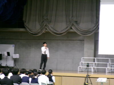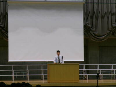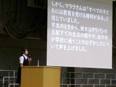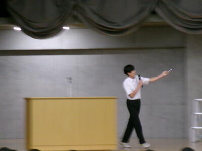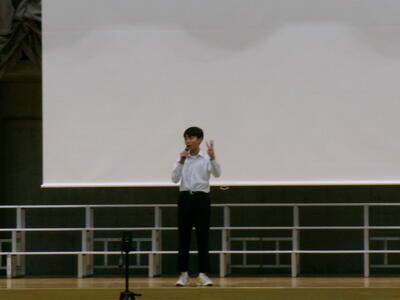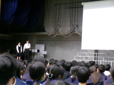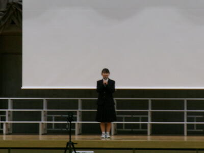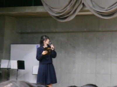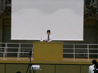 ▼英語スピーチコンテストの発表。今日は9月に行われた発表会(→詳細はこちら)とは違って、誰にでも発表内容が理解できるように、ステージ上に字幕が登場しました。