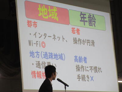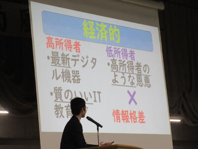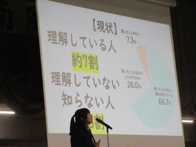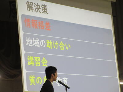 ▼2年生は「社会問題」について、調べたことに加えて、自分なりの考察を加えて発表します。