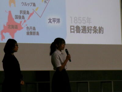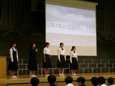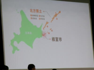 ▼夏休み中の8月26日から28日の3日間、北方領土の視察に出向いた5名の子ども達が、北方領土についてまとめ、近くまで出向いて見学したことなどをわかりやすく発表。自分の考えを述べてくれました。