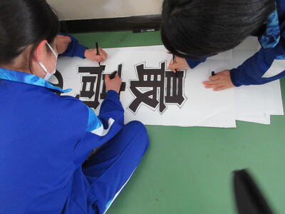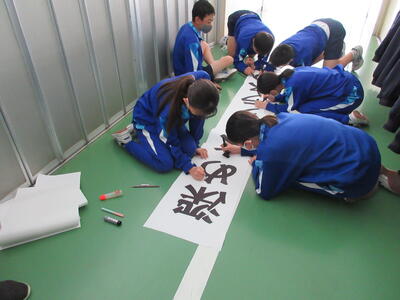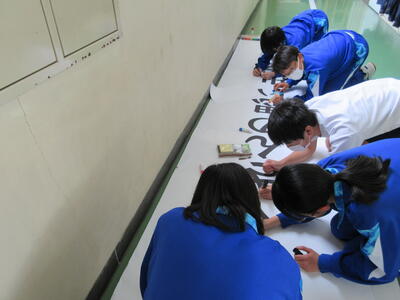 一方、2年生は廊下でグループごとに垂れ幕作りに励みます。新入生に贈る言葉に、まるで命を吹き込むかのように懸命な作業を続けていました。
