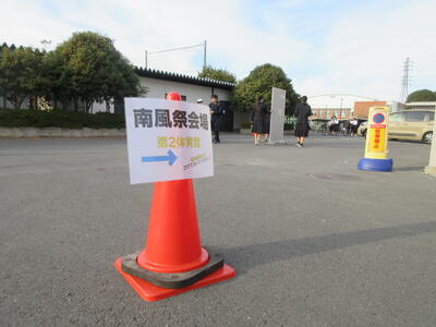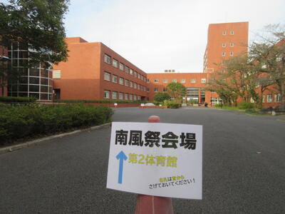 ▼会場への案内表示はスクールアシスタント、益戸先生の手作り。それぞれのポイントごとに指し示す向きを変えて、スムーズに第2体育館へとたどり着けるよう的確に案内してくれます。保護者の皆様方、明日はこちらの表示に従ってお進みください。