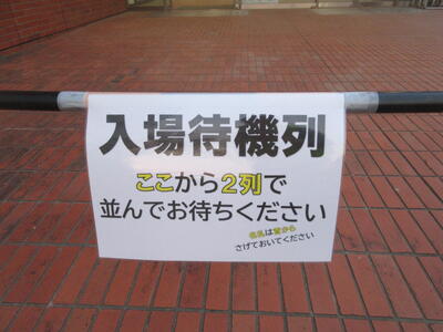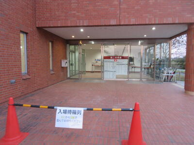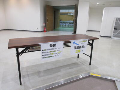 ▼こちらが受付。スリッパ等をご持参の上、内履きと外履きを入れる袋をご持参ください。この玄関から2階観客席にお進みください。