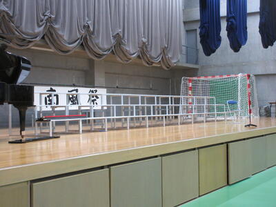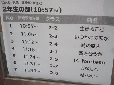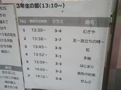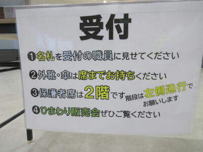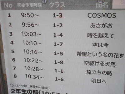 ▼第2体育館の玄関には、明日のプログラムが表示されています。会場の関係で保護者の皆様は最大2名まで。2階の観客席でのご参観となります。また、学年毎に入れ替えとなります。ご協力、よろしくお願いいたします。