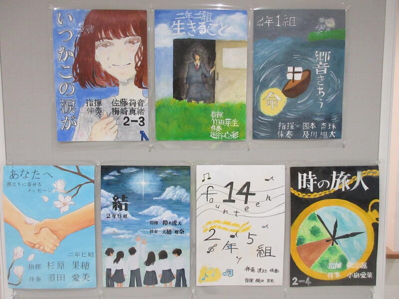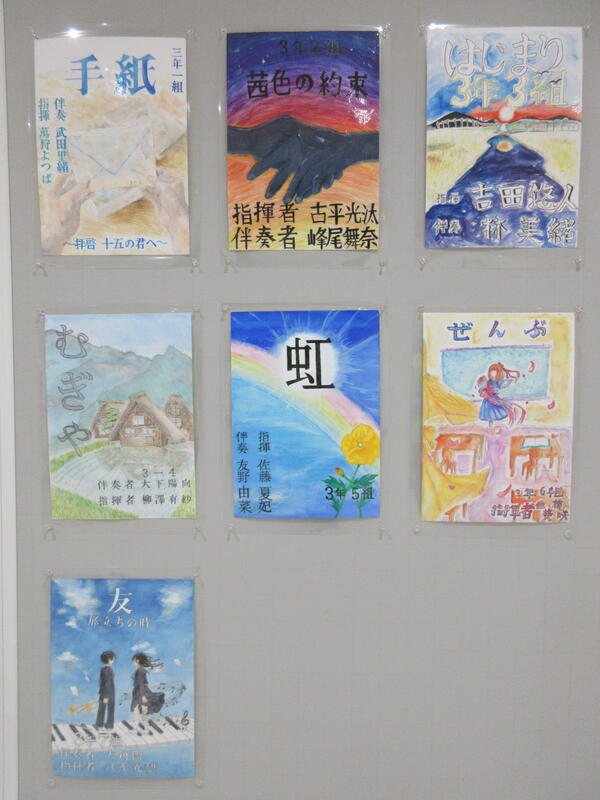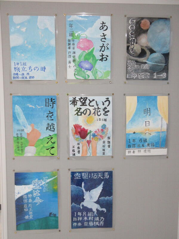 ▼受付の左には、各学級の合唱曲を紹介するポスターが掲示されています。子ども達の手作りの素敵なポスターを是非ご覧ください!!