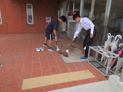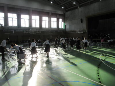 ▼明日から2日間の「南風祭」の主会場となる第2体育館。掃除やパイプ椅子並べで、子ども達が忙しく動き回ります。「関わり 考え 自分達で創る」南風祭。南流中伝統のこの行事も、毎年こうして生徒達の力で受け継がれてきました。