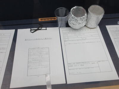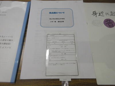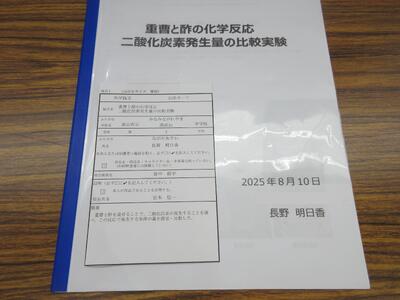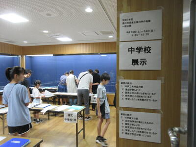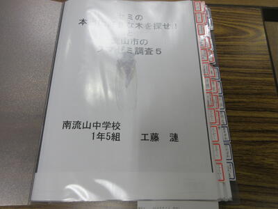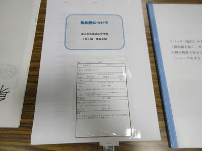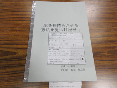 「重曹と酢の化学反応 一酸化炭素発生量の比較実験」長野明日香さん(3年)入賞/「気化熱について」重高正輝さん(2年)優秀賞/【生ごみの臭いはどうしたら臭いをおさえることができるのだろうか?】古西悠乃さん(2年)入賞/「肉のやわらかさについて」山口友里さん(2年)入賞/「水の質(軟水や硬水など)が植物生育へ与える影響の実験」長井彩歩さん(2年)入賞/「スパイク(強打)やチャンスボール(放物線を描く、ゆるいボール)はどれくらいの腕の角度であると一番良いカット(レシーブをすること)ができるのだろう」小岩井佑香さん(2年)入賞/「アオドウガネの色覚と臭覚の研究~アオドウガネが好む色と香りは何か?~」林優樹さん(1年)最優秀賞/「セミの本当に好きな木を探せ!と流山市のクマゼミ調査5」工藤漣さん(1年)最優秀賞/「氷を長持ちさせる方法を見つけ出せ!」髙木悠之介さん(1年)入賞/「大好きな海」半田蒼空さん(1年)入賞