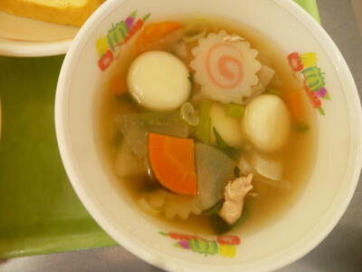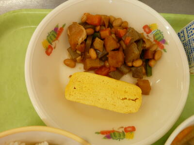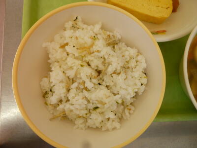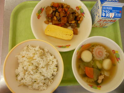 今日の給食は【菜めしじゃこごはん、厚焼き卵、五目煮、白玉汁、牛乳】です。