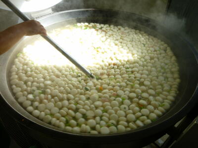 今日は、お月見に時にお供えするお団子のような白玉もちを、すまし汁の中に入れました。また、豆名月にちなみ、煮物に大豆を使っています。秋の収穫や実りに感謝を込めていただきましょう。