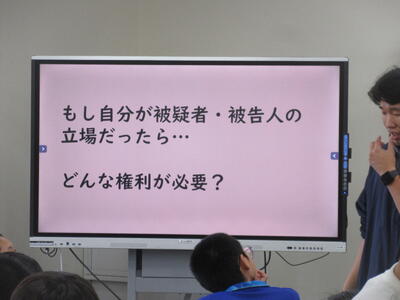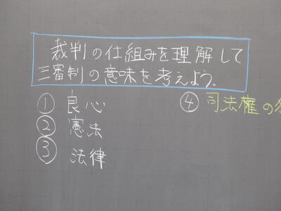 ▼こちらも3年生社会科、公民の授業。「もし自分が被疑者・被告人の立場だったら、どんな権利が必要?」との問いを話し合っていく子ども達。自分に置き換えて考えることで、三審制の意味に結びつけていきます。