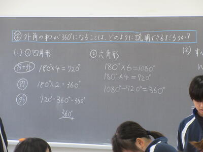 ▼2年生の数学。「外角の和が360°になることは、どのように説明できるのだろうか?」という課題に対して、活発に話し合っていく子ども達です。