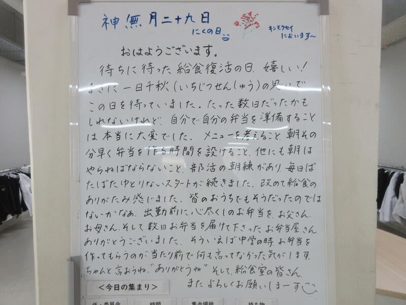 ▼C棟2階のホワイトボード。河崎先生から給食復活を喜ぶメッセージ、そして改めてお弁当を作ってくださったお家の方、お弁当屋さんへの感謝の言葉が続きます。当たり前のことなんてありません。子ども達には、日々の一つ一つに感謝できる人に、そして、その言葉をきちんと伝えられる人になってほしいですね。