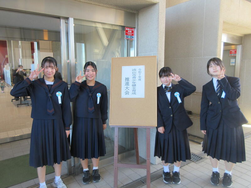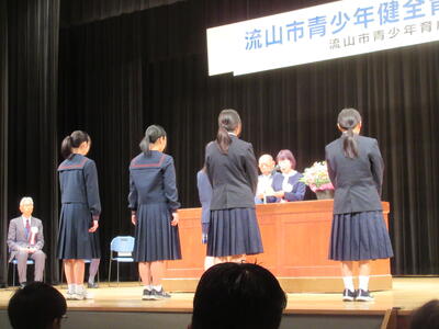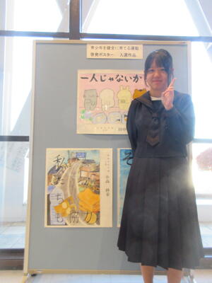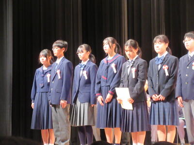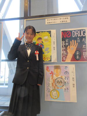 本校からは「善行少年」として池田萌乃さん、村主心美さん、緒方構里さん、松雪唯さんの4名と、ポスターの部で小高紗采さん(3年)、飯尾柚希さん(1年)の2名の合計6名が表彰されました。