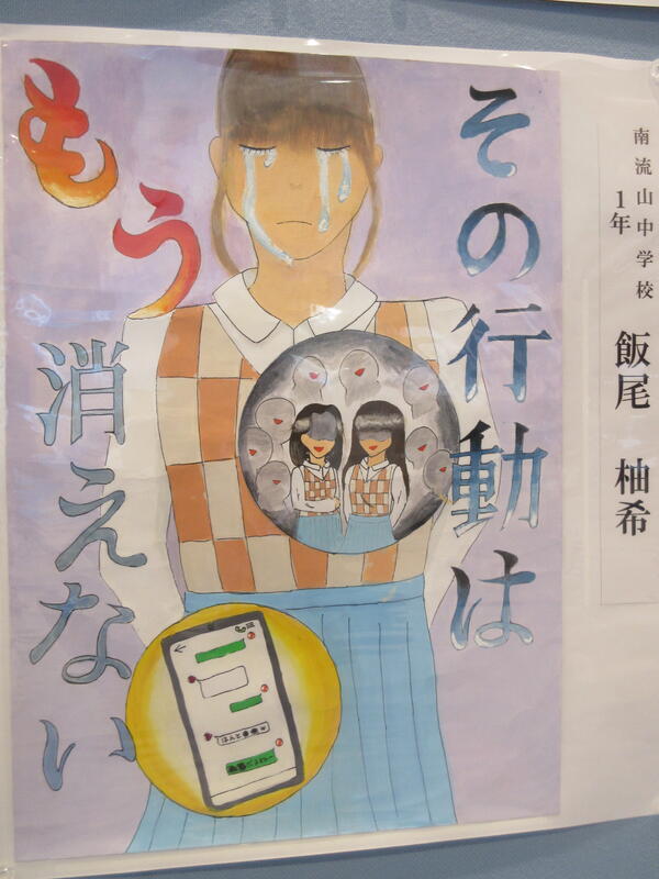 ▼ポスターの部で入選した飯尾柚希さん(1年)とその作品「その行動はもう消えない」。SNSの使用について、見る人に注意を呼びかけています。