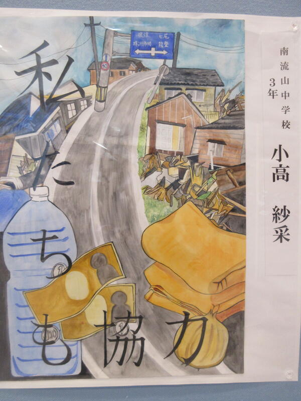 ▼同じくポスターの部で入選した小高紗采さん(3年)とその作品「私たちも協力」。能登地震への募金や物資寄付についての協力を呼びかけています。