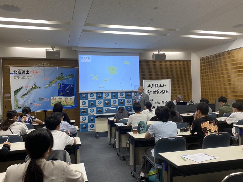 午前中の2カ所(羅臼国後展望塔、野付半島ネイチャーセンター)の見学を終えた一行は午後、北海道立北方四島交流センター(→詳細はこちら:北海道根室振興局HPより)を視察。歯舞群島の勇留島〈ゆりとう〉(→詳細はこちら:ウィキペディアより)の元島民の方からお話を伺いました。