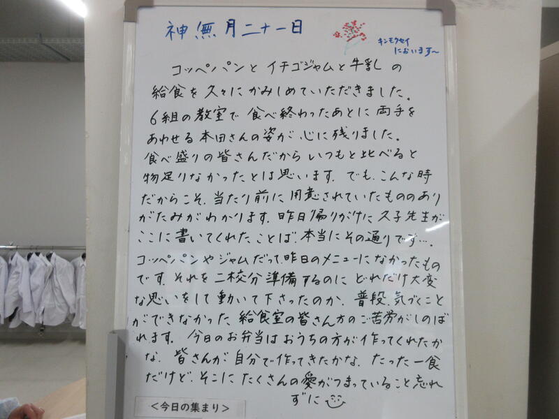 ▼C棟2階のホワイトボード。昨日の給食について、河崎先生からのメッセージが書かれていました。