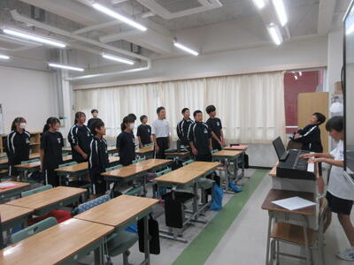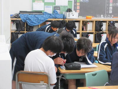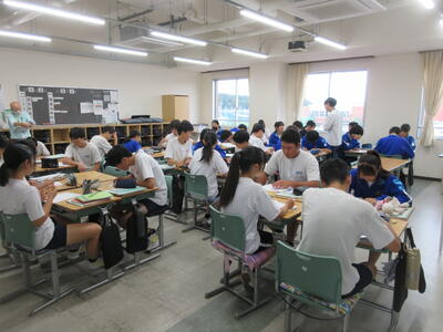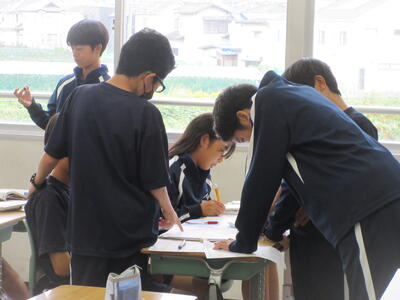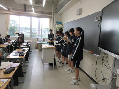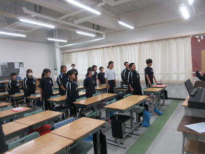 ▼6校時のE棟の方から「Cosmos」を歌う1年生と思しき素晴らしい合唱が聞こえてきます。覗いてみると1年3組の子ども達が、合唱隊形ではなくその場に立って歌っているのです。この隊形でこれほど見事な合唱とは!! 感動で鳥肌が立ちます!!
