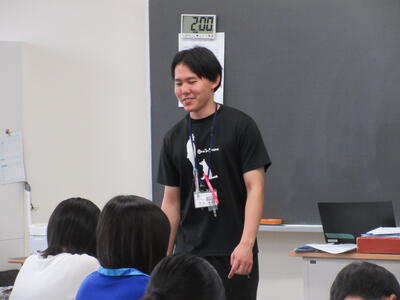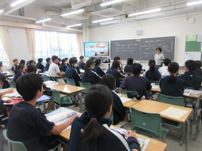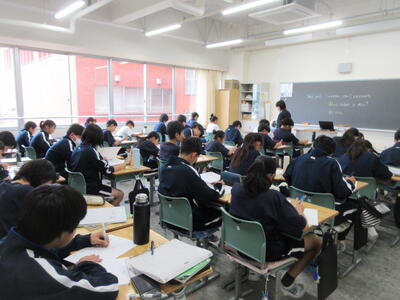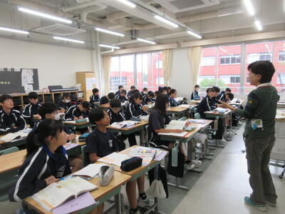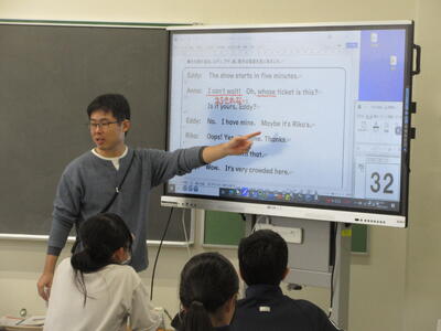 ▼1年生の英語。野中仁人先生の流暢な英語が飛び交います。子ども達も進んで反応。とても良いムードで授業が進んでいます。